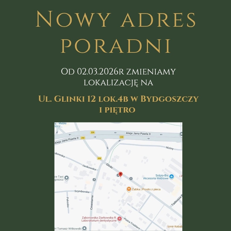 Informujemy, że od 2 marca 2026 r. nasza poradnia zmienia lokalizację. Od tego dnia zapraszamy Państwa do nowej siedziby mieszczącej się przy: ul. Glinki 12 lok. 4B, Bydgoszcz Nowa przestrzeń została przygotowana z myślą o zapewnieniu jeszcze większego komfortu oraz atmosfery sprzyjającej pracy terapeutycznej i konsultacjom dietetycznym. Wszystkie wizyty zaplanowane od 2 marca będą odbywać […]